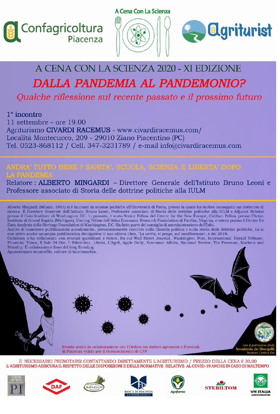 Piacenza, 11 settembre 2020 – A cena con la Scienza 2020, XI edizione – “Andrà tutto bene? Sanità, scuola, scienza e libertà dopo la Pandemia”