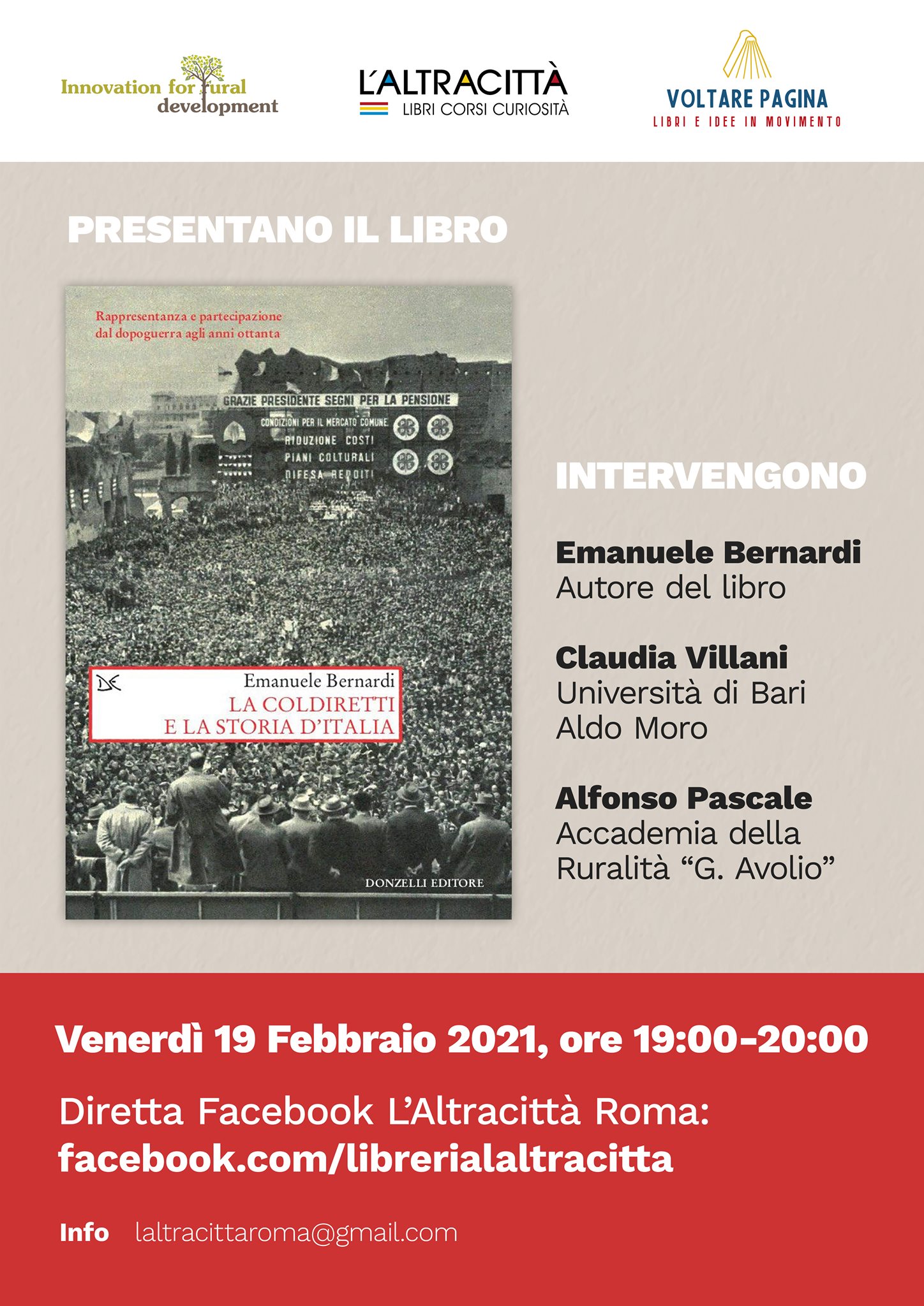 L’associazione IfoRD, la libreria L’AltraCittà e l’associazione Voltare Pagina organizzano il 19 febbraio 2021, dalle 19:00 alle 20:00, la presentazione del libro La Coldiretti e la storia d’Italia, di Emanuele Bernardi. Discuteranno con l’autore Claudia Villani e Alfonso Pascale.