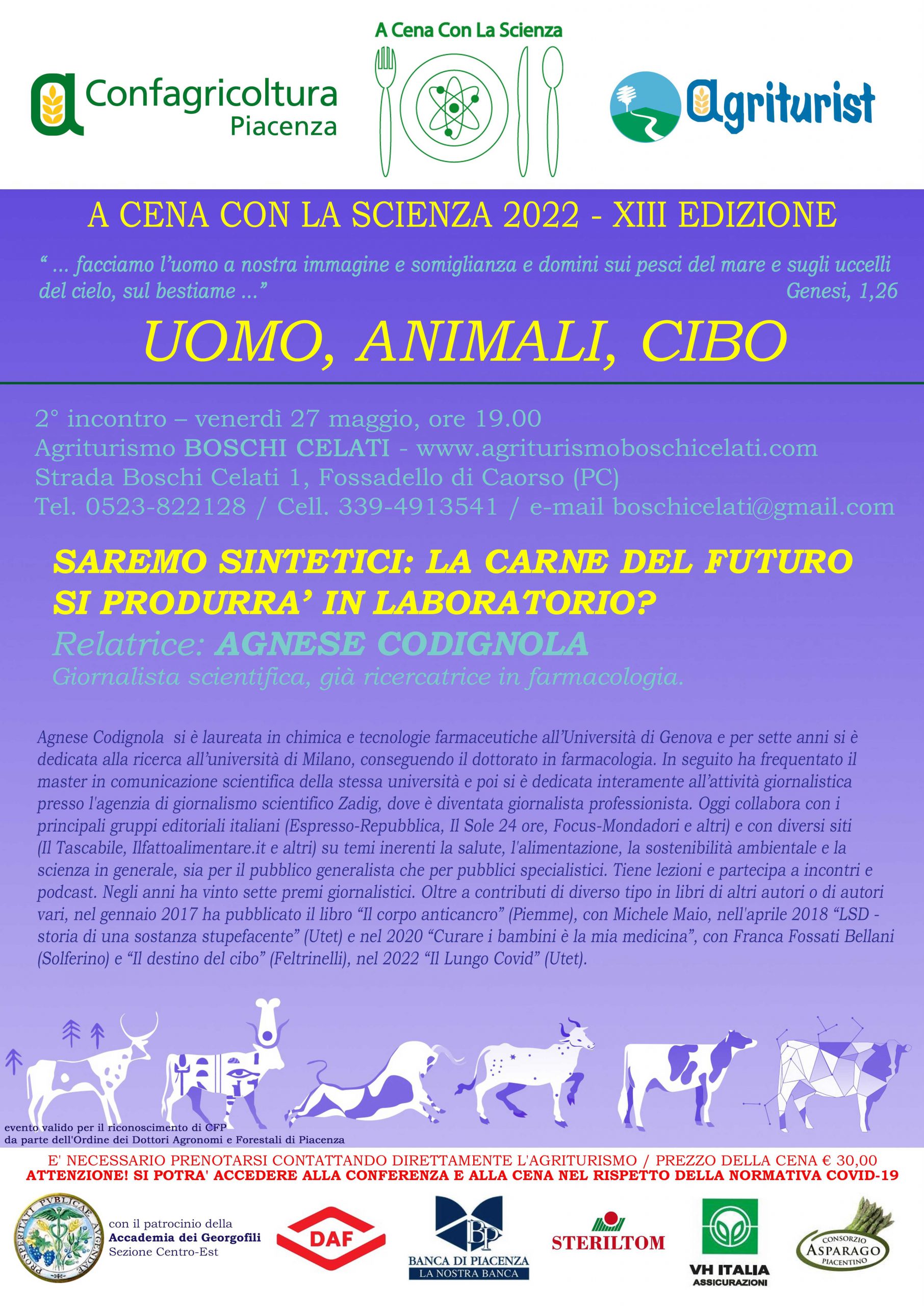 27 maggio 2022 – Secondo appuntamento di A CENA CON LA SCIENZA 2022 XIII EDIZIONE – “Saremo sintetici: la carne del futuro si produrrà in laboratorio?”