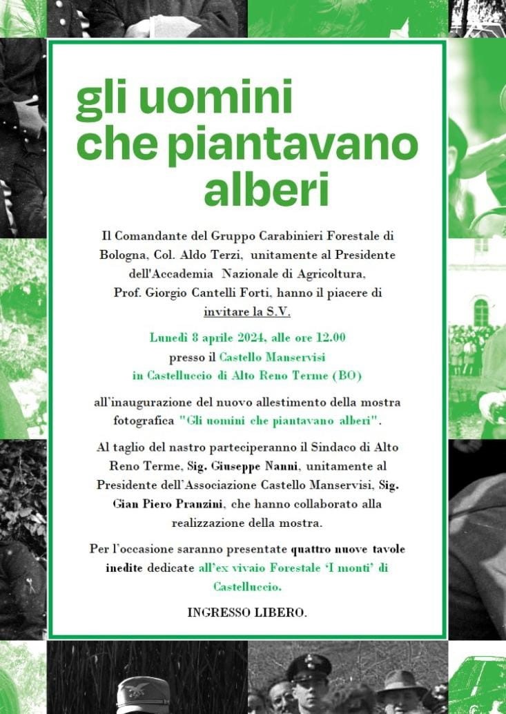 Il Comandante del Gruppo Carabinieri Forestale di Bologna, Col. Aldo Terzi, unitamente al Presidente dell’Accademia Nazionale di Agricoltura, Prof. Giorgio Cantelli Forti, hanno il piacere di invitare la S.V. lunedì 8 aprile 2024, alle ore 12.00, presso il Castello Manservisi in Castelluccio di Alto Reno Terme (BO), all’inaugurazione del nuovo allestimento della mostra fotografica “Gli uomini che piantavano alberi”.