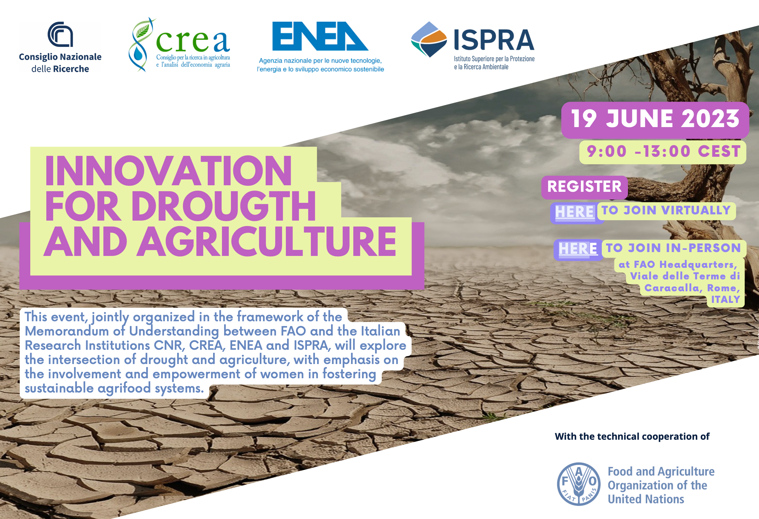 L’evento è organizzato congiuntamente dagli enti di ricerca coinvolti nel MoU e in occasione della Giornata Mondiale della Lotta alla Desertificazione e alla Siccità che ricorre il 17 giugno.