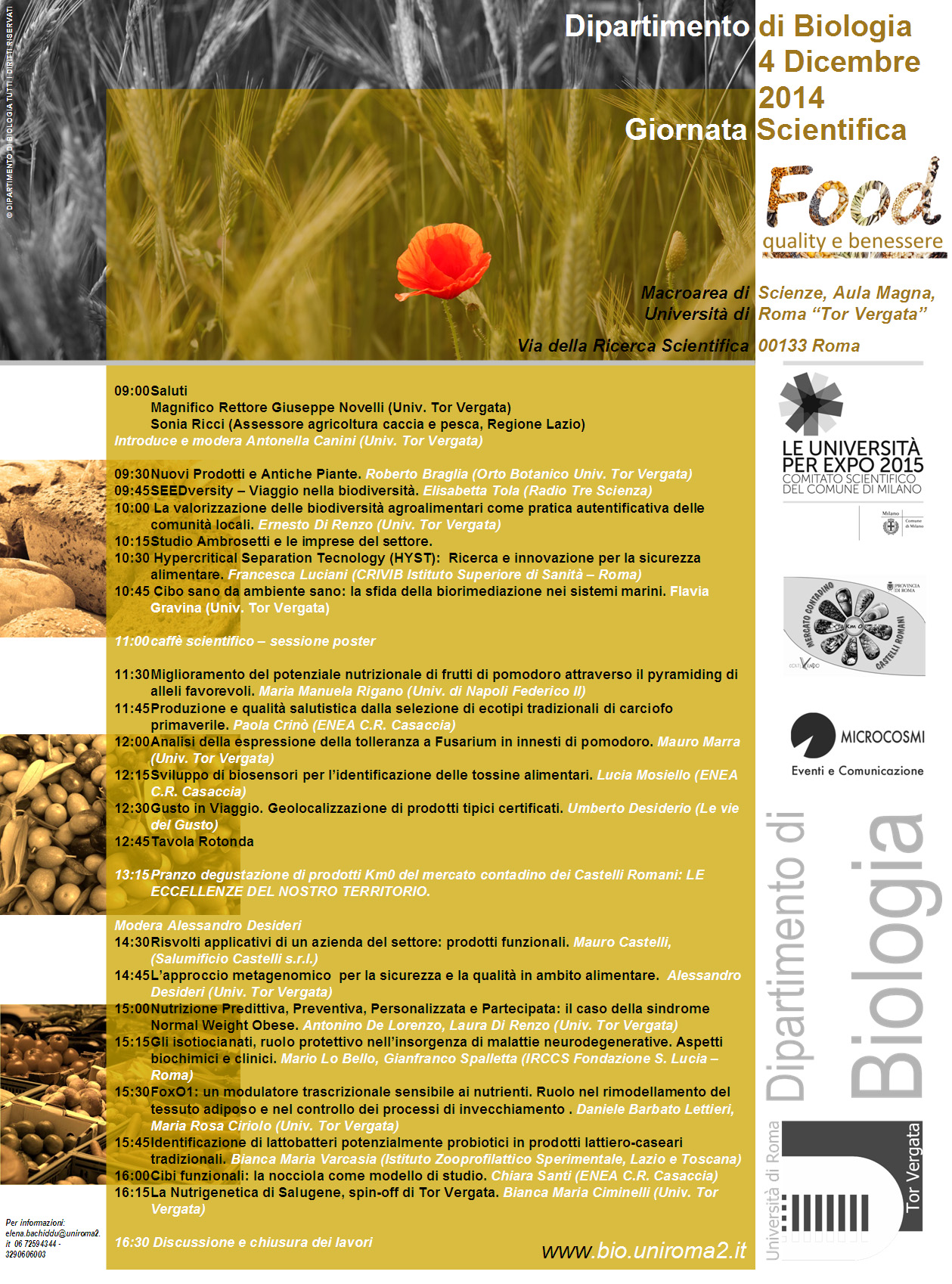 Si terrà il prossimo giovedì 4 dicembre 2014 presso l’Università degli Studi di Roma Tor Vergata l’evento “Food quality e benessere”, una giornata di incontri scientifici e divulgativi dedicata al tema del cibo. La giornata è aperta a contributi che da varie prospettive esplorino il nesso nutrizione-salute, la ricerca sulla produzione di alimenti salutari e altamente nutritivi nelle strategie di prevenzione delle malattie, la qualità delle produzioni agroalimentari e la tutela della biodiversità, la valorizzazione delle tradizioni alimentari e dei saperi gastronomici.