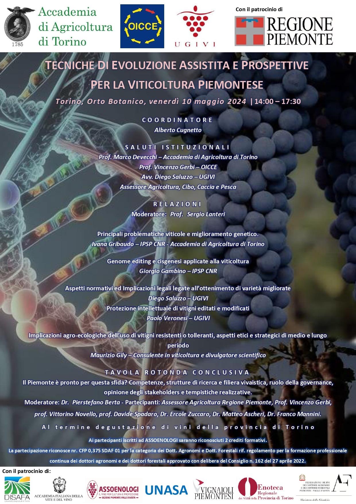 Torino, 10 maggio 2024 – Convegno “TECNICHE DI EVOLUZIONE ASSISTITA E PROSPETTIVE PER LA VITICOLTURA PIEMONTESE”
